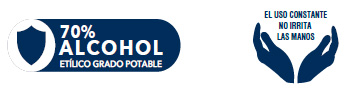 Elaborado con alcohol etílico en una concentración al 70%. Contiene emolientes que humectan y suavizan la piel. Elimina virus, bacterias, hongos, esporas y organismos dañinos en sólo 30 segundos.